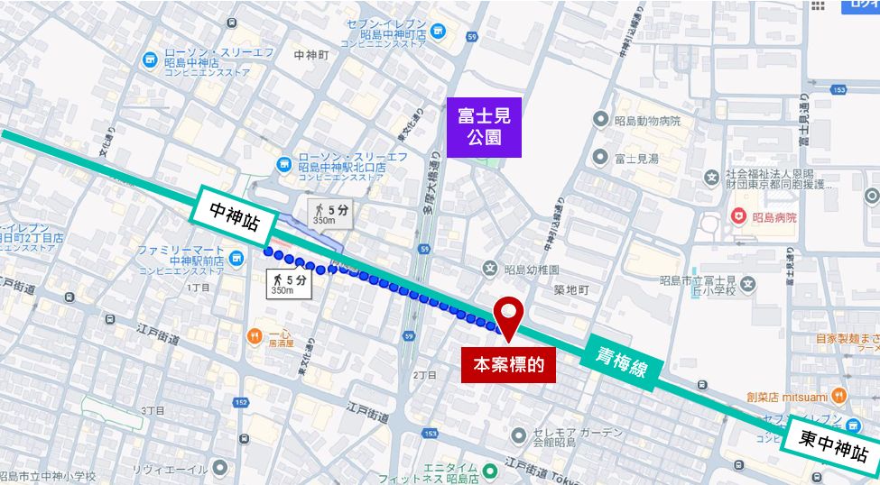 - JR 青梅線「東中神站」走路約5分鐘