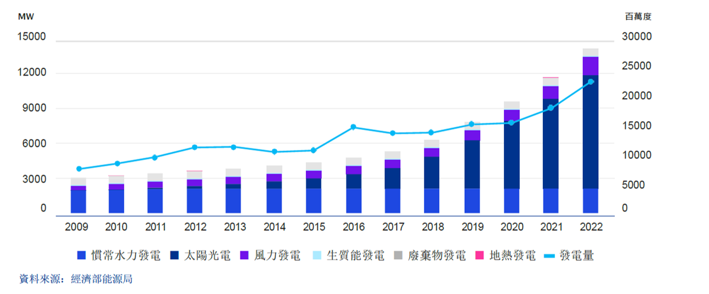 2023 年政府因應產業需求及淨零轉型,加速推動綠能設置。太陽能設置方面,由於台灣國土面積小,目前地面型及水面型開發已趨飽和,主要以屋頂型或漁電共生、農電共生為持續推動方向, 例如今年五月份立院三讀通過一定條件的新建、增建或改建建築物,應於屋頂設置一定裝置容量太陽光電發電設備,將提高太陽能之設置量。