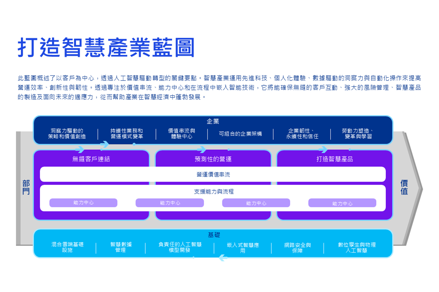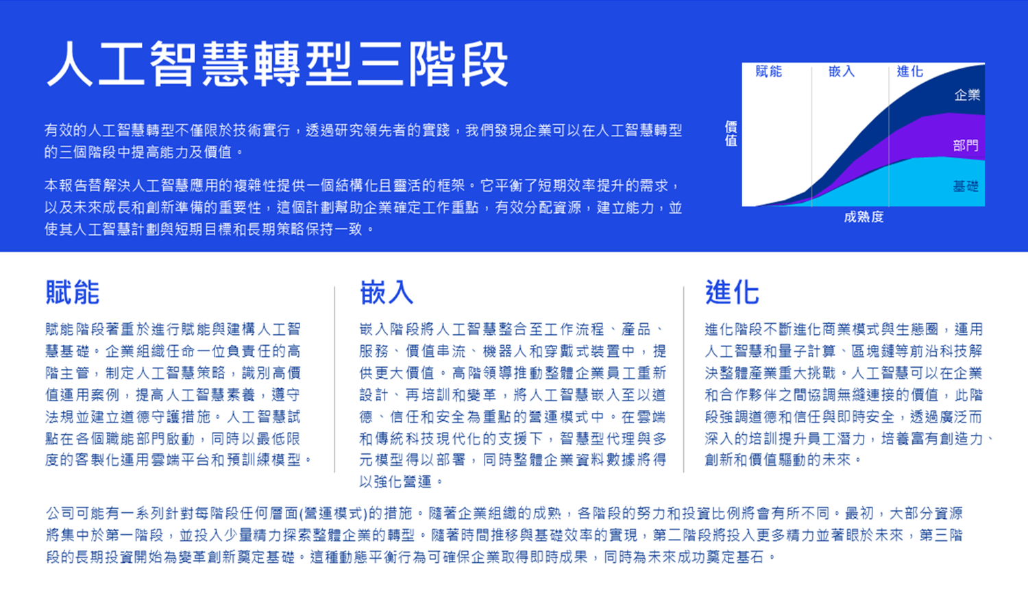 為了幫助企業在轉型之路中取得成功,有效將AI技術嵌入到價值流中,本報告提出了AI發展三階段:「賦能」、「嵌入」與「進化」。透過系統性解析AI導入歷程,並清楚劃分各階段的執行重點,企業將能高效整合AI於工作流程中,充分釋放其潛能,創建智慧產業。