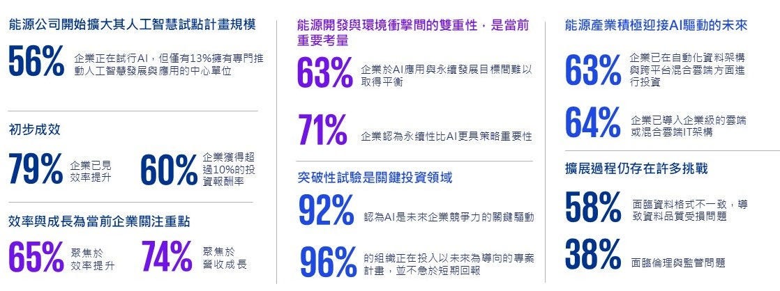 目前已有56%的企業正在擴大AI計畫,另有44%的企業已將AI整合為營運核心的一部分,儘管受監管與非監管機構的差異(以及各子產業的特性)影響,AI所面臨的挑戰與機會在整體上仍大致相同。能源價值鏈上的企業正逐步聚焦於共同的AI應用場景,例如營運效率提升、資產最佳化、安全性、永續發展與預測性維護等領域。