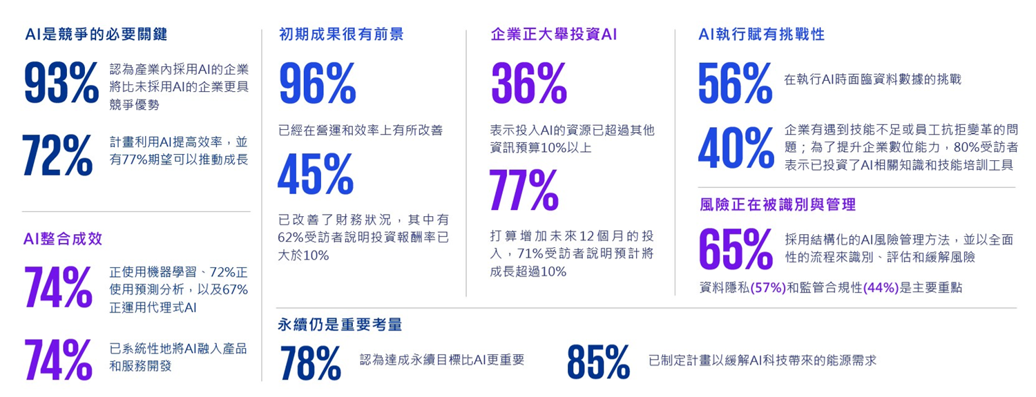 工業產業領域的AI領導者認為擁抱AI不再是可有可無而是策略必要性,93%的受訪者認為企業要全面整合AI,將比未採用AI的企業更具競爭優勢。
