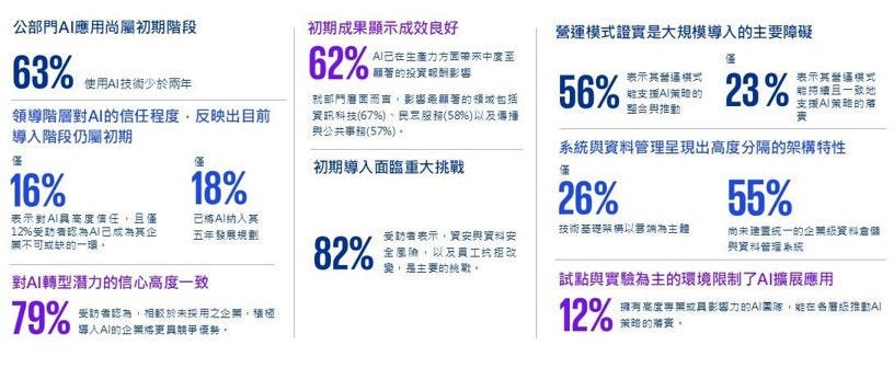 全球各地政府仍處於AI導入的早期階段,近三分之二的公部門領導者表示,其機構使用AI的時間尚不足兩年,僅有12%的受訪者認為AI已成為組織不可或缺的部分,另有18%已將AI納入五年期的策略規劃中。儘管實際應用尚未普及,對AI潛力的信心仍然強勁,79%受訪者認同AI將帶來策略性優勢。令人鼓舞的是,初期導入已在資訊科技(67%)、客服(58%)及溝通(57%)領域展現正面成效。