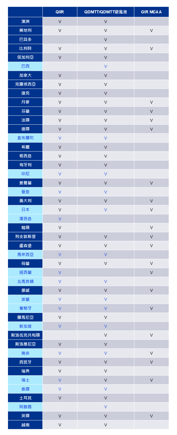 截至2025年10月8日,具有合格所得涵蓋原則(QIIR)、合格國內最低稅負制(QDMTT)且有資格加入QDMTT避風港的租稅管轄區、及已簽屬GIR MCAA之租稅管轄區記錄如下。