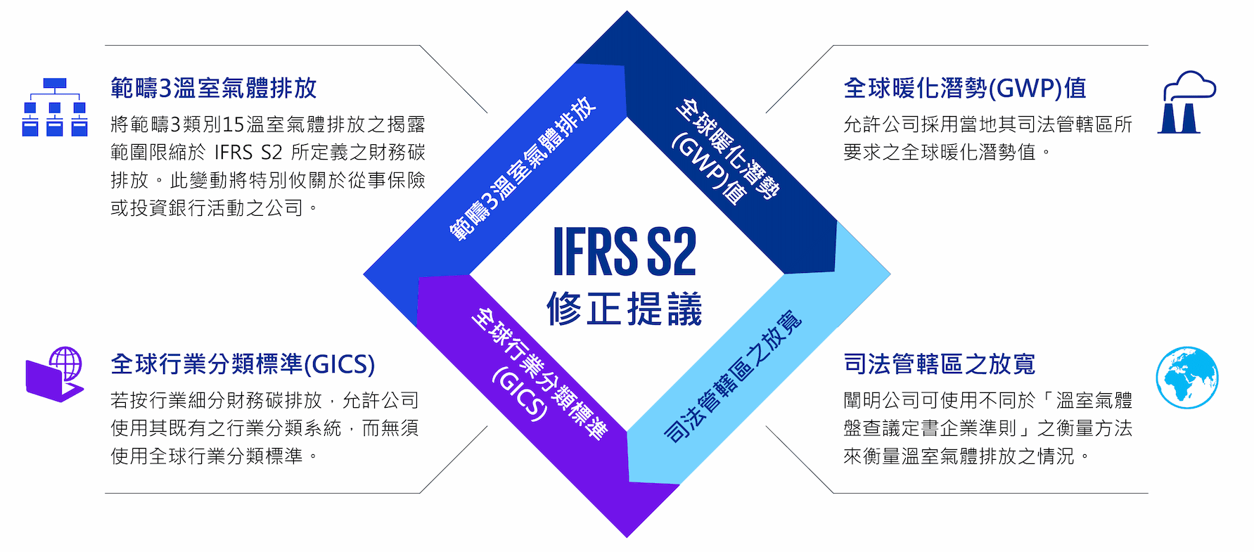 對IFRS S2「氣候相關揭露」針對性的修正可能改變公司揭露排放之方式。利害關係人(包括主管機關、編製者以及投資者)對IFRS S2之回饋意見聚焦於「若闡明則可協助其適用準則」的領域。作為因應,國際永續準則理事會(ISSB)正提議對下列領域進行修正: