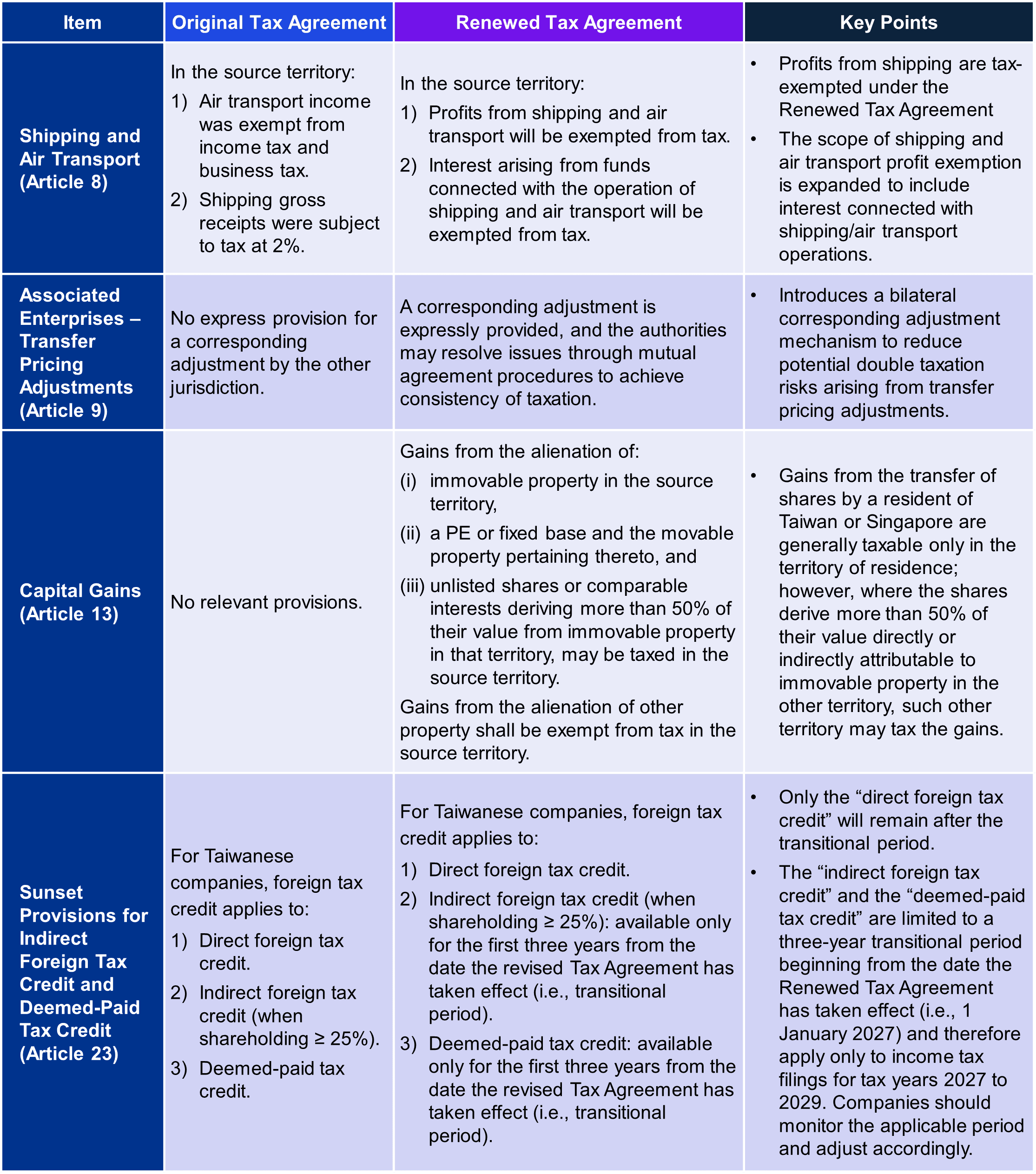 The Renewed Tax Agreement removes this exclusion and aligns with other Taiwan comprehensive income tax agreements. This change is expected to substantially reduce the tax exposure associated with cross‑border management services and provide multinational groups with greater flexibility in determining service‑provider location.