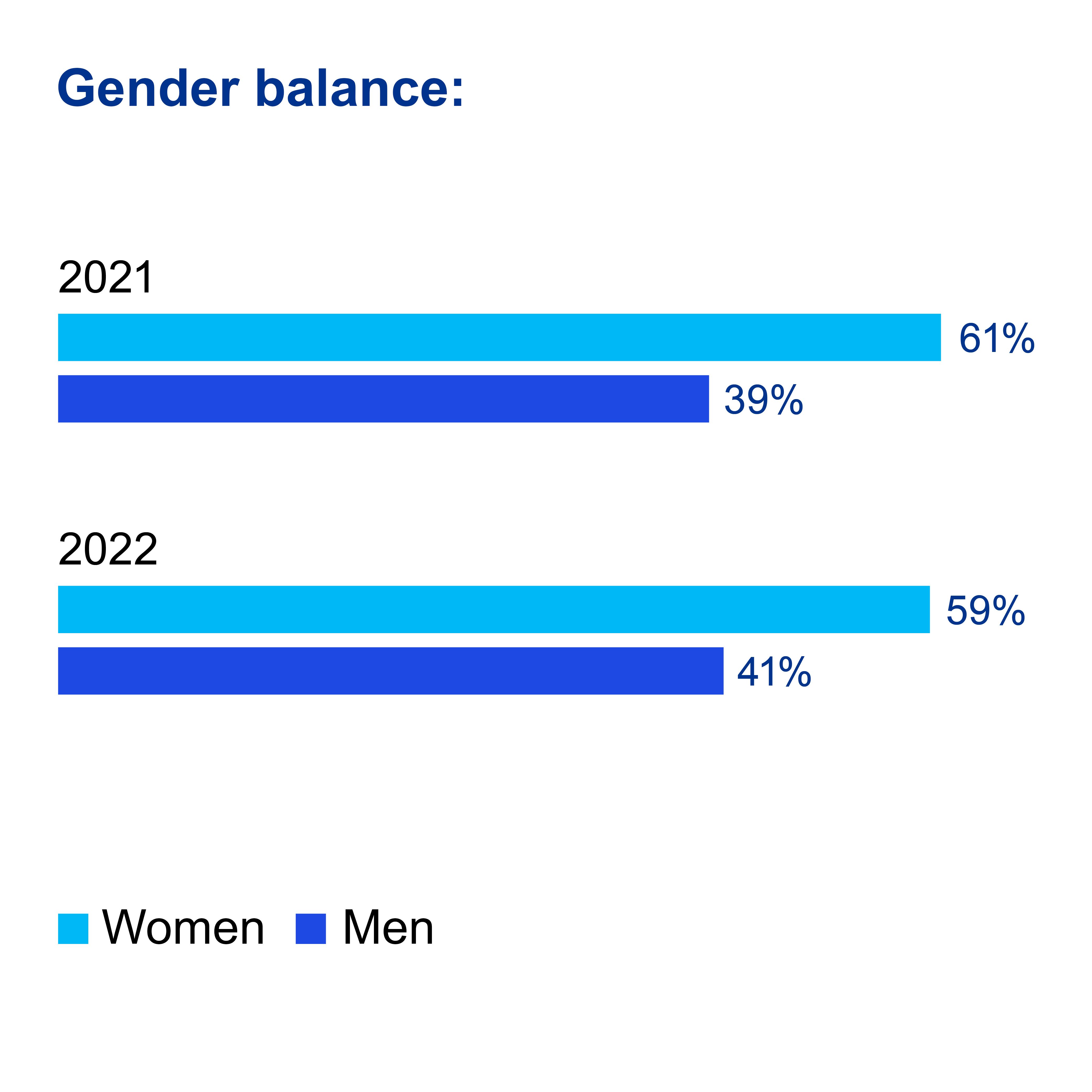 The overall average male/female employee balance in the company as a whole is 60/40.