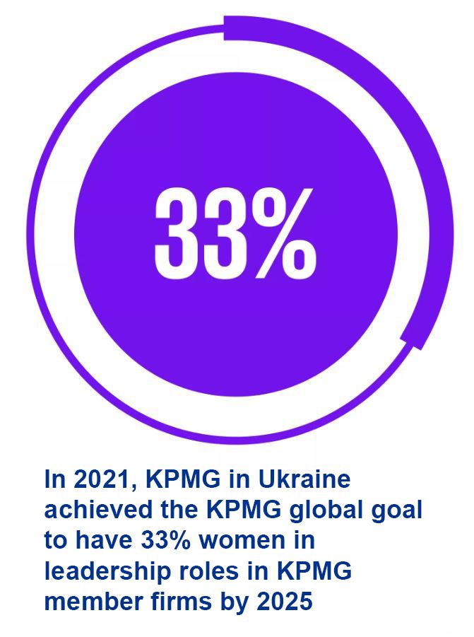 Since 2021, women at KPMG in Ukraine have consistently represented 33% of directors and partners (67% men, accordingly).