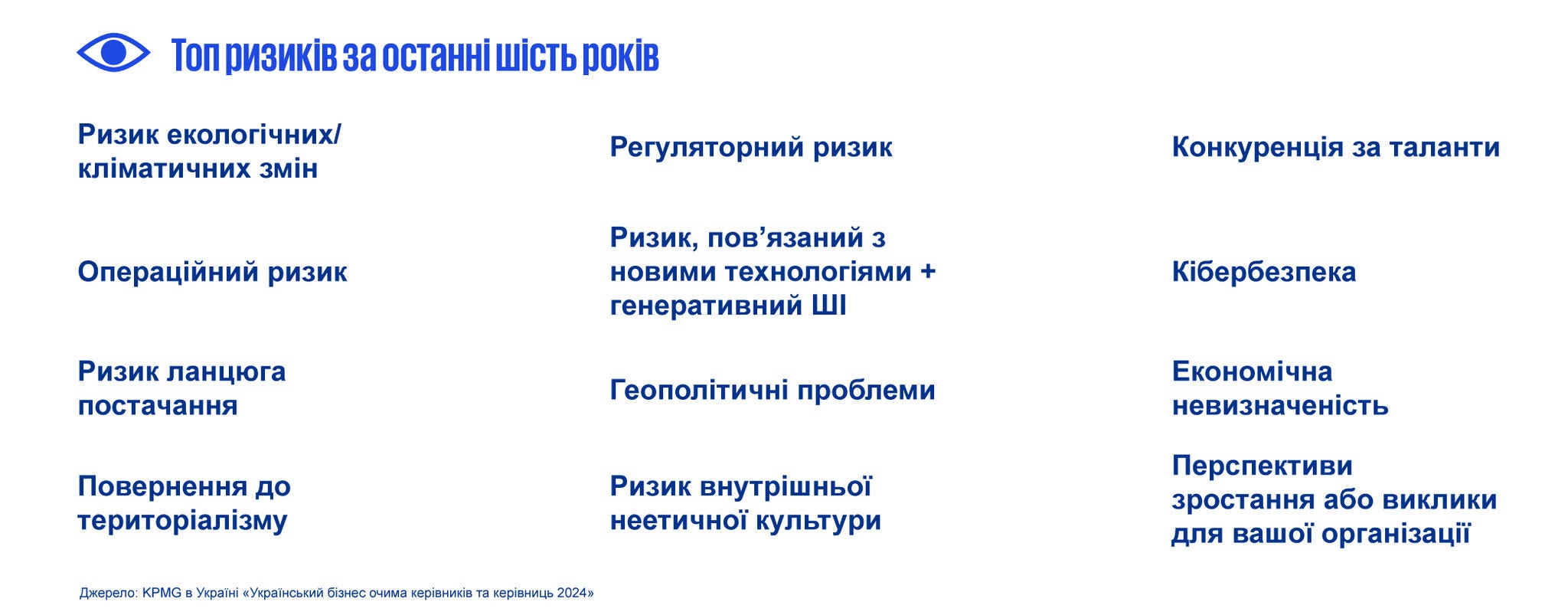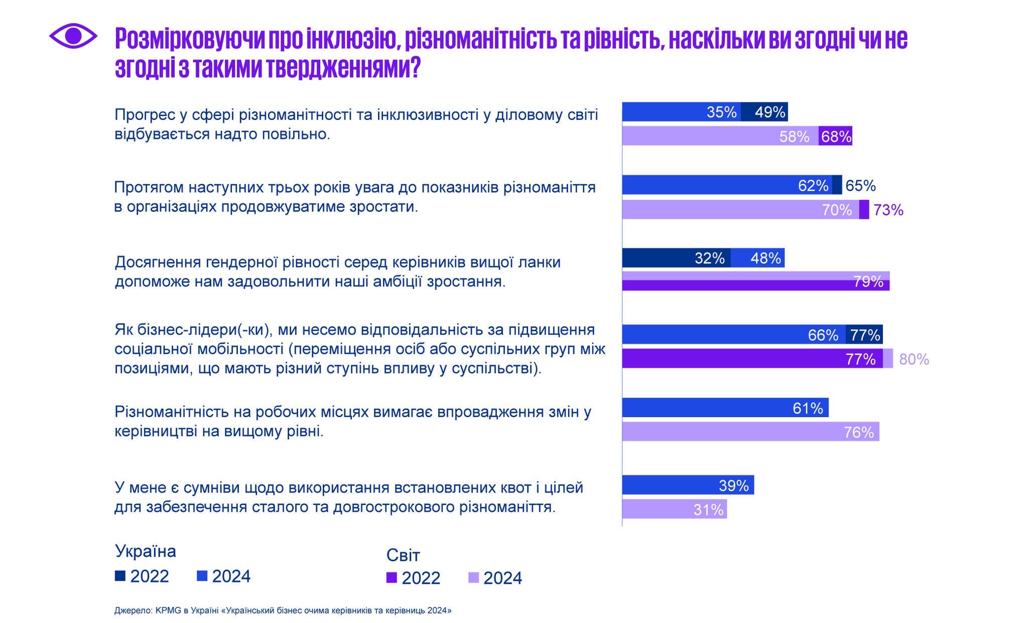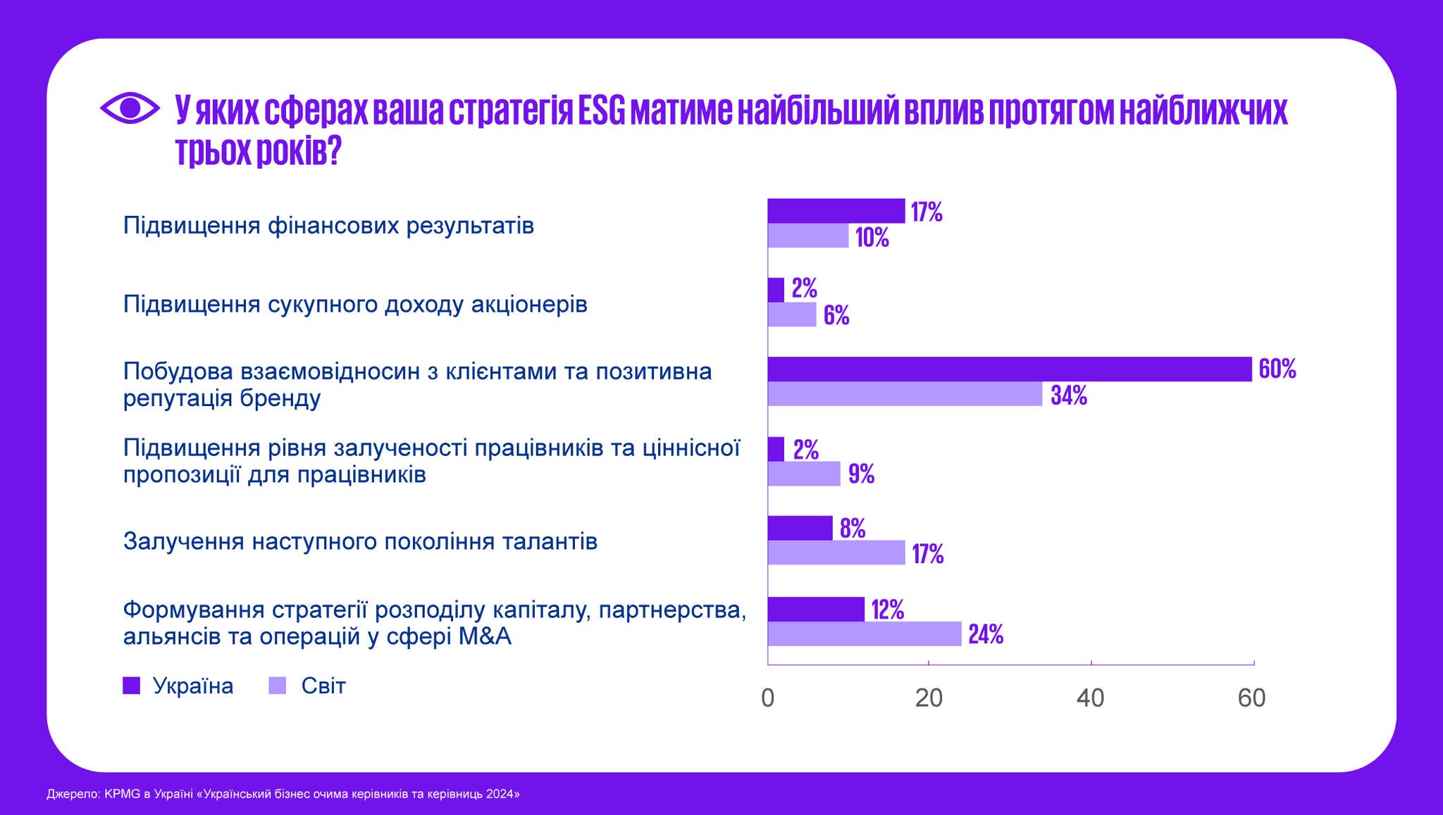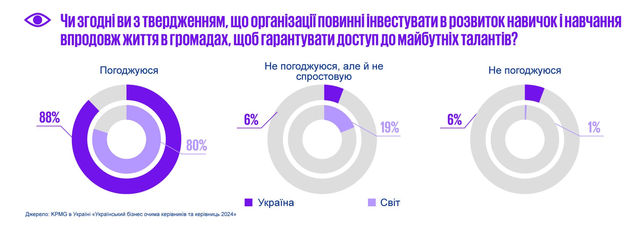 Цьогорічне українське дослідження, проведене у серпні-вересні 2024 року, надає унікальний погляд на те, як українські CEO оцінюють економічні перспективи, інтеграцію ESG-принципів, стратегії залучення талантів, використання новітніх технологій і штучного інтелекту, а також на досягнення гендерного балансу в бізнесі. Результати дослідження відображають, як компанії адаптуються до викликів, що виникають на тлі глобальних змін, і які стратегії забезпечують стійке зростання та розвиток у нинішніх умовах життя країни, зокрема і війни. Інформаційним партнером дослідження 2024 року в Україні став Глобальний договір ООН в Україні.