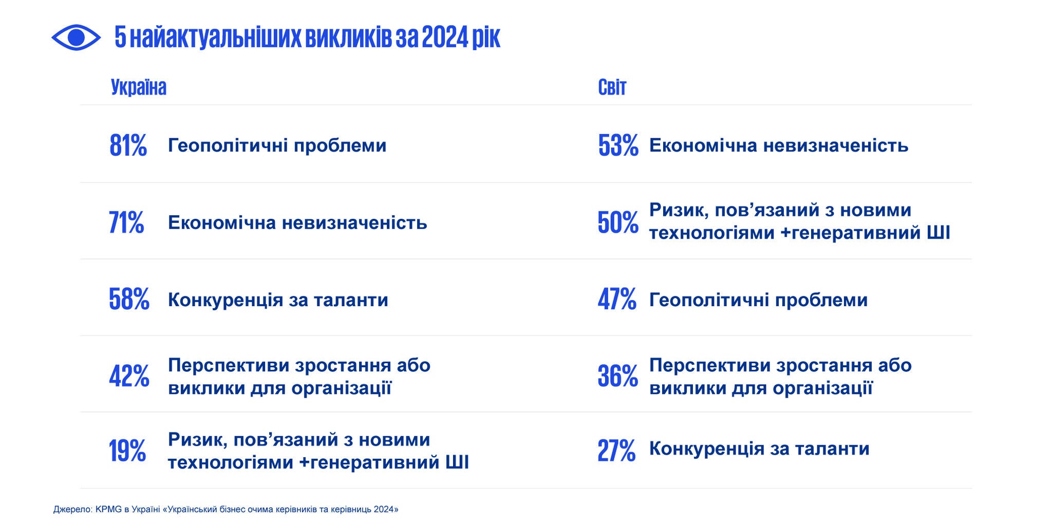 Шосте дослідження KPMG CEO Outlook в Україні проводиться в рамках глобального дослідження, яке вже 10 років є важливим джерелом інсайтів для керівників по всьому світу. Глобальна версія дослідження цьогоріч залучила понад 1 300 CEO з різних країн та бізнес-сегментів, що дає можливість оцінити найбільш актуальні тенденції та стратегічні пріоритети на світовому рівні.