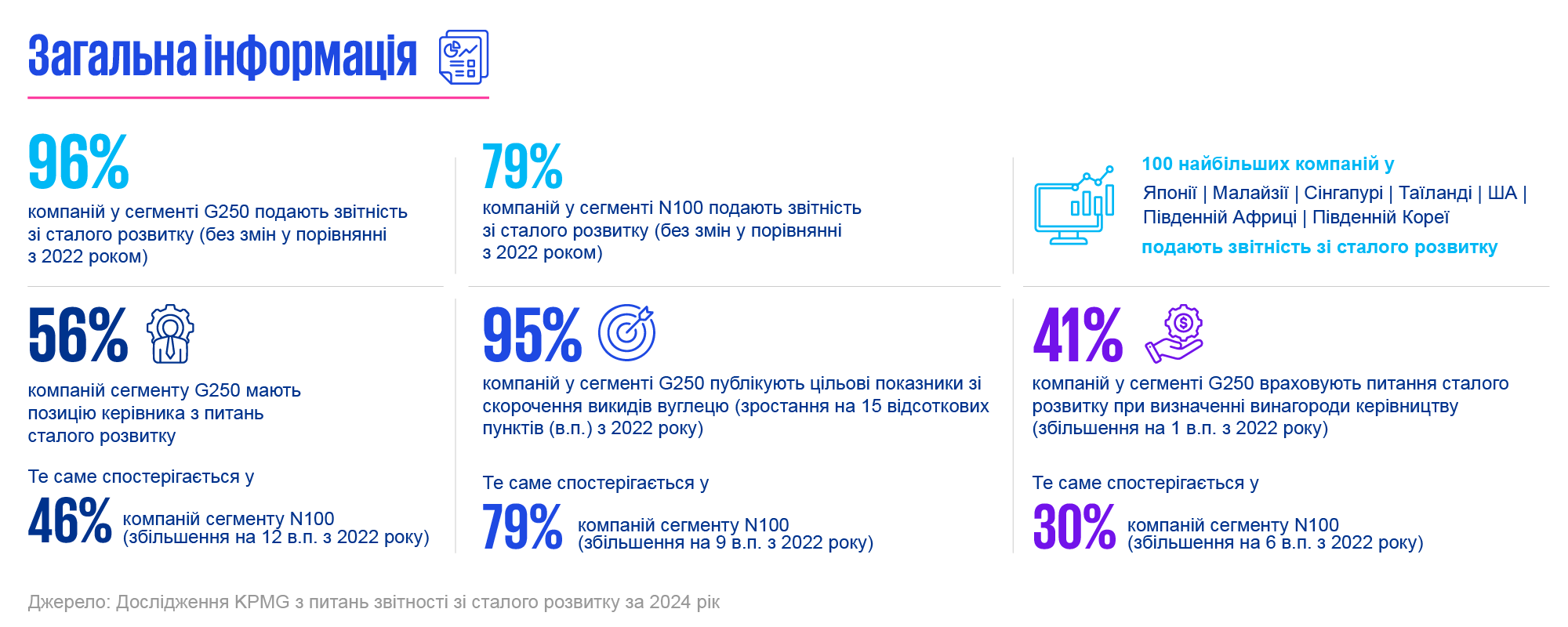 Дослідження KPMG з питань звітності зі сталого розвитку за 2024 рік свідчить про загальну тенденцію підготовки компаній по всьому світу до впровадження обов'язкового звітування зі сталого розвитку. Дослідження показує, що звітність зі сталого розвитку стала частиною повсякденного ведення бізнесу майже для всіх 250 найбільших компаній світу (G250) та переважної більшості з сотні провідних компаній у кожній країні, території чи юрисдикції (N100). За останні два роки значно зросла частка компаній, які публікують цільові показники зі скорочення викидів вуглецю. Частка компаній, які звітують щодо збереження біорізноманіття, залишається нижчою, але й вона зросла у порівнянні з 2022 роком.