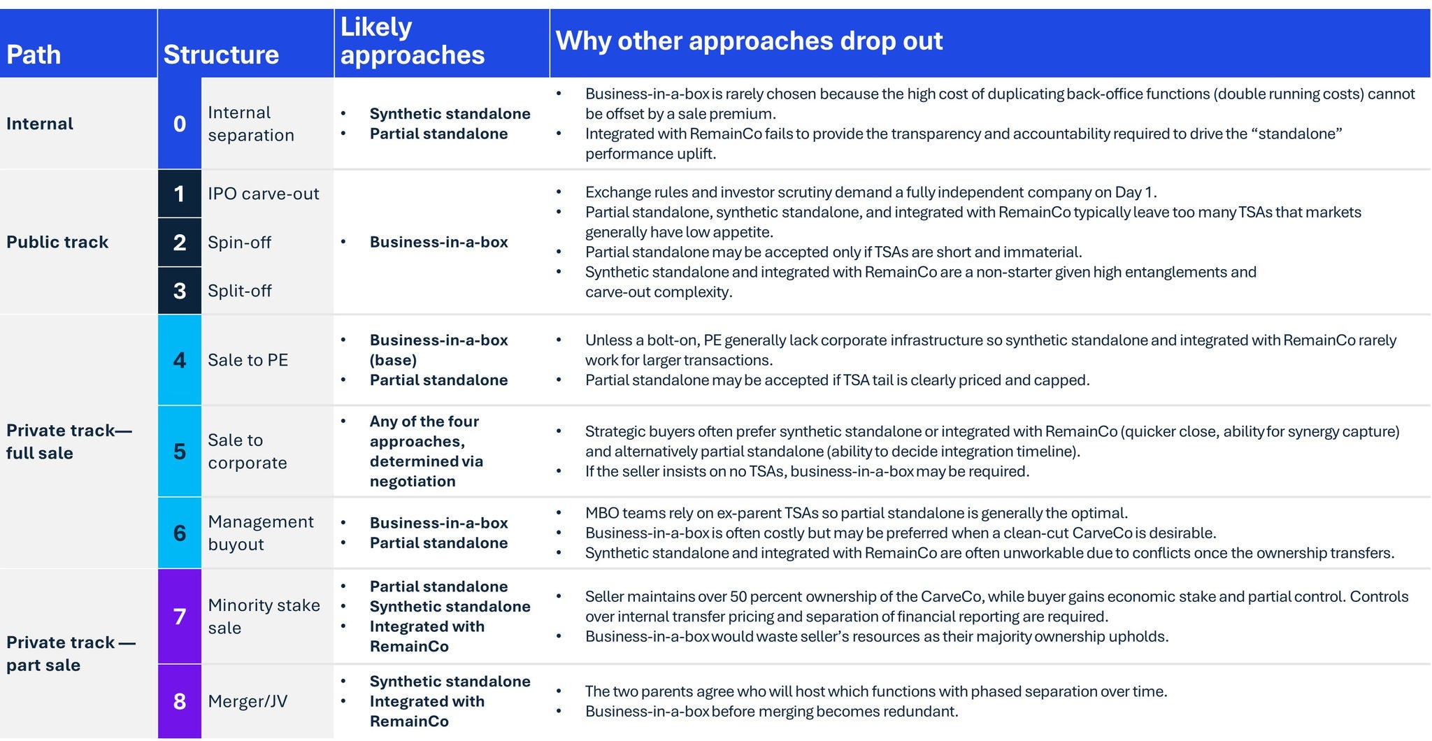 Where the buyer universe is unknown, there are multiple exit options, or where the buyers are likely to be strategics looking to recognise synergies, sellers may want to consider taking a ‘partial standalone’ approach. This is where the CarveCo business operates independently while the RemainCo provides certain support functions such as HR, IT, transactional finance etc and operational foundations through intercompany service agreements. This approach enables sellers to focus on revenue value opportunities while avoiding the build-up of a fully separate operating model.