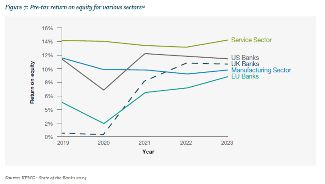 - European bank-specific taxes are higher than those in North America, while their RoE is comparatively lower, as highlighted by both the IMF and KPMG.