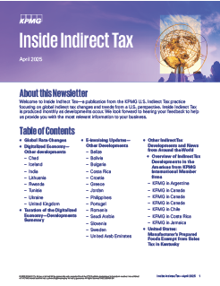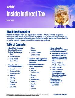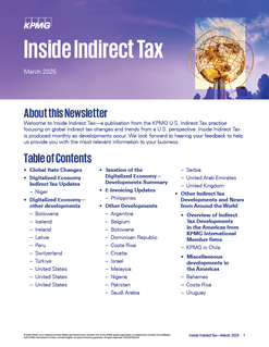 KPMG knows how important it is to stay current on global indirect tax developments, especially in countries where you currently do business or are looking to expand. That's why we developed Inside Indirect Tax: Global Updates from a U.S. Perspective.