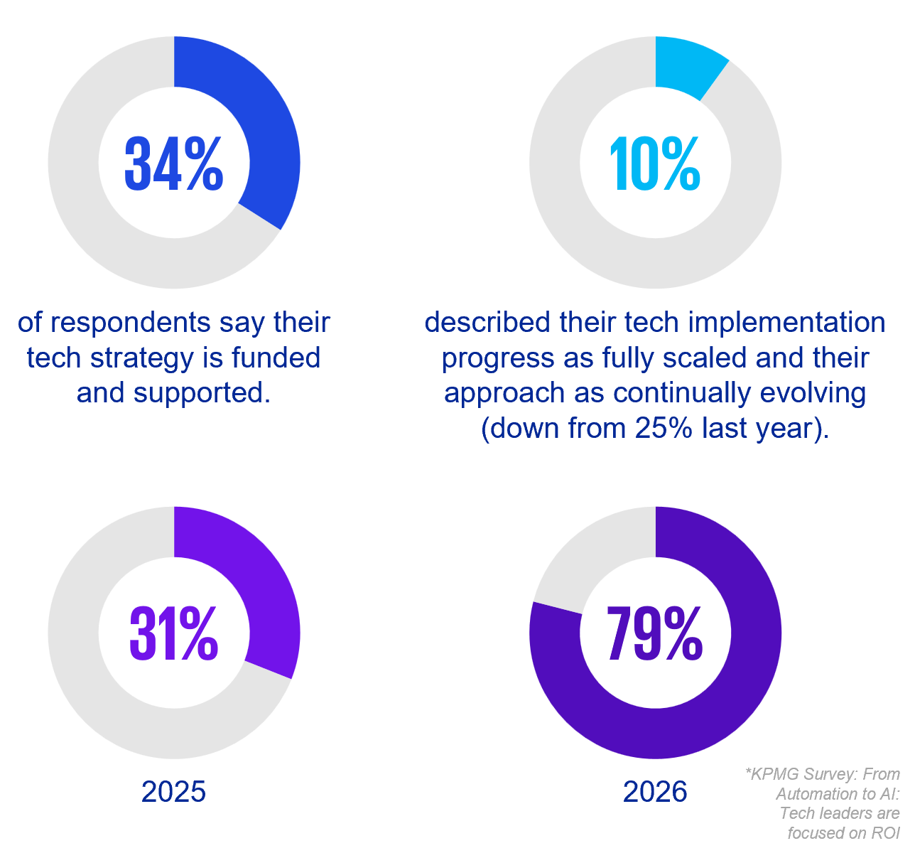 US firms’ tech journeys have slipped back slightly year-on-year, especially in scaling AI use cases. While 34 percent of respondents say their tech strategy is funded and supported, only 10 percent describe their tech implementation progress, on average, as fully scaled and their approach continually evolving.