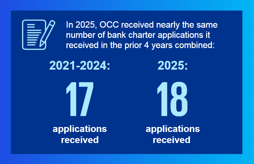 Throughout 2025 regulatory agency leadership has championed competition and innovation within the banking industry with particular interest in new entrants. In public statements they encourage new charter applications with discussions of/plans for faster reviews, streamlined processes, and an “open-minded” approach.