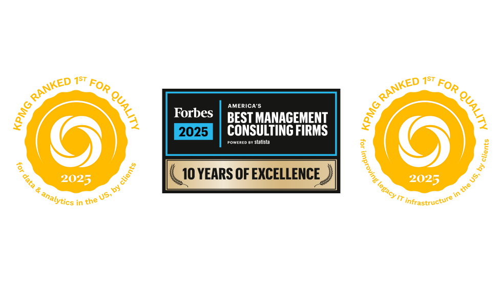 KPMG was named one of Forbes’ Best Management Consulting Firms of 2025 in the category of IT Strategy & Implementation and #1 for quality of work in improving legacy IT infrastructure and #1 for quality of work in data & analytics, in a survey of US clients by Source.