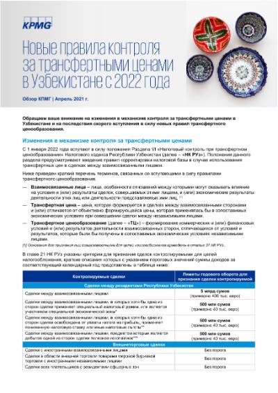 С 1 января 2022 года вводится в действие глава VI Налогового кодекса Республики Узбекистан «налоговый контроль при трансфертном ценообразовании» (далее – ТЦО). Данный раздел регламентирует подачу отчётности, предоставление документации о контролируемых сделках для налоговых целей, проведение налоговых проверок трансфертных цен, самостоятельных корректировок и заключения соглашений о ценообразовании.
