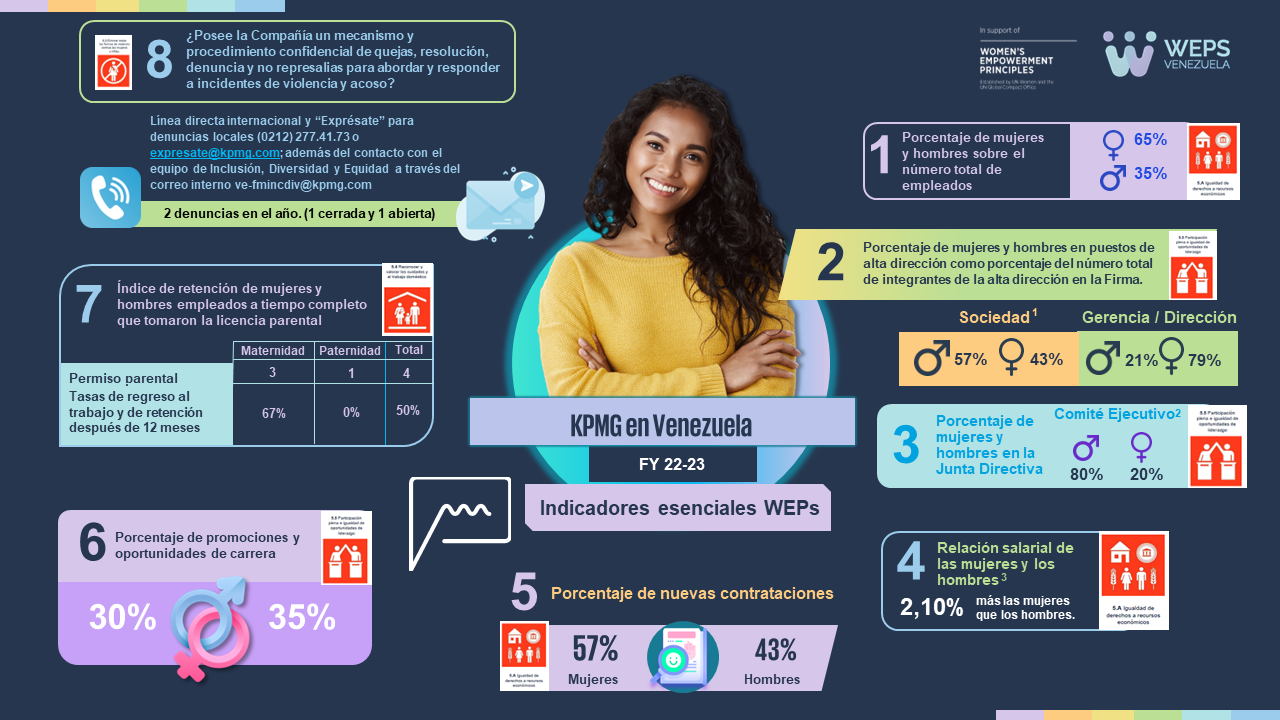 En KPMG sabemos que la rendición de cuentas es fundamental para crear un cambio significativo. A través de nuestros objetivos, expectativas y compromisos claros de Inclusión, Diversidad y Equidad (IDE) y como Firma signataria de los Principios para el Empoderamiento de las Mujeres (WEPs por sus siglas en inglés), presentamos para nuestros grupos de interés, el progreso de nuestra gestión corporativa de IDE durante el período comprendido entre el 1° de octubre de 2022 y el 30 de septiembre de 2023 (FY22-23).