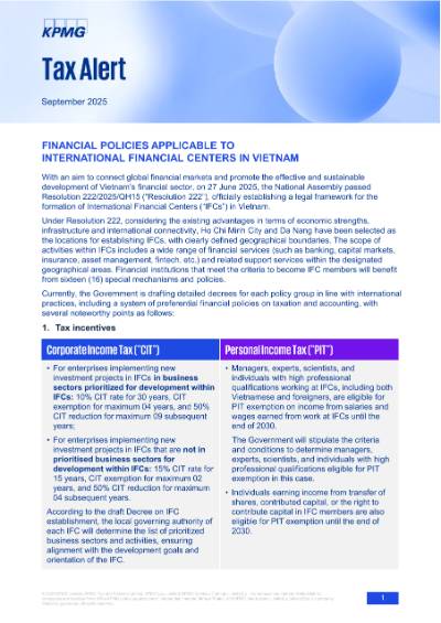 Under Resolution 222, considering the existing advantages in terms of economic strengths, infrastructure and international connectivity, Ho Chi Minh City and Da Nang have been selected as the locations for establishing IFCs, with clearly defined geographical boundaries. The scope of activities within IFCs includes a wide range of financial services (such as banking, capital markets, insurance, asset management, fintech, etc.) and related support services within the designated geographical areas. Financial institutions that meet the criteria to become IFC members will benefit from sixteen (16) special mechanisms and policies.