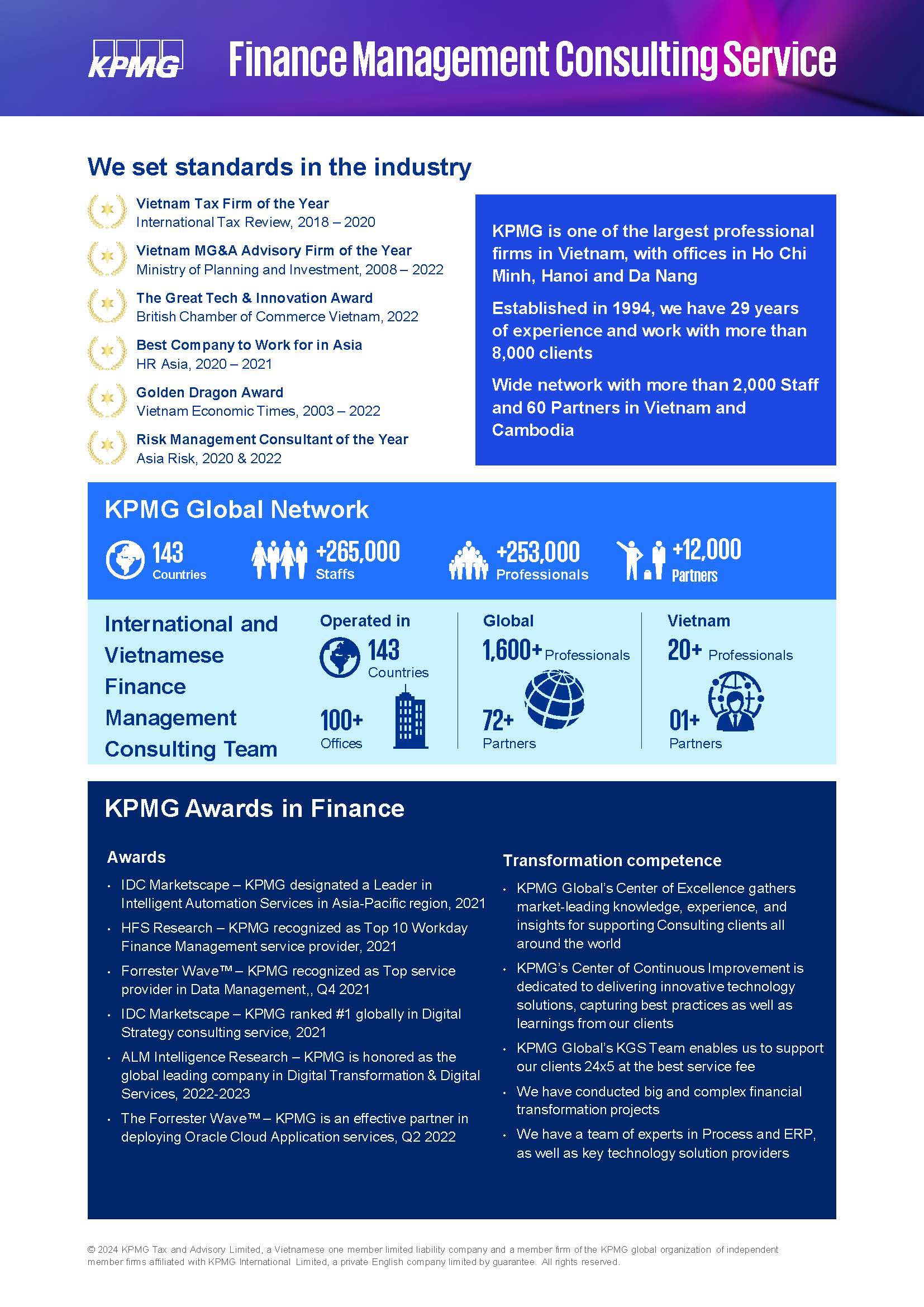 For your business's success, choose KPMG Vietnam, a financial management consulting firm with a proven track record and a client-centric approach. Contact us to learn more about our services, including finance transformation, enterprise performance management, and digital finance.