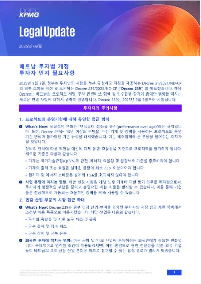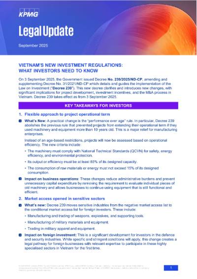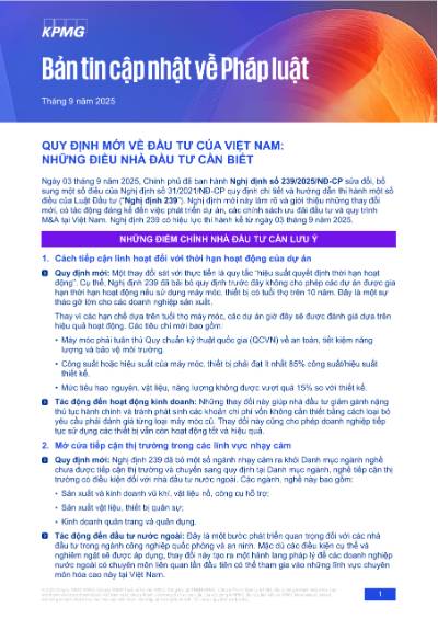 Ngày 03 tháng 9 năm 2025, Chính phủ đã ban hành Nghị định số 239/2025/NĐ-CP sửa đổi, bổ sung một số điều của Nghị định số 31/2021/NĐ-CP quy định chi tiết và hướng dẫn thi hành một số điều của Luật Đầu tư (“Nghị định 239”). Nghị định mới này làm rõ và giới thiệu những thay đổi mới, có tác động đáng kể đến việc phát triển dự án, các chính sách ưu đãi đầu tư và quy trình M&A tại Việt Nam. Nghị định 239 có hiệu lực thi hành kể từ ngày 03 tháng 9 năm 2025.