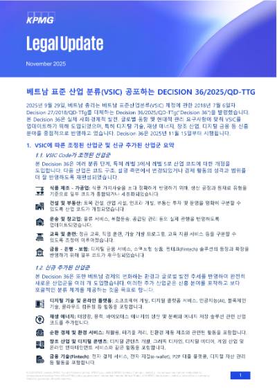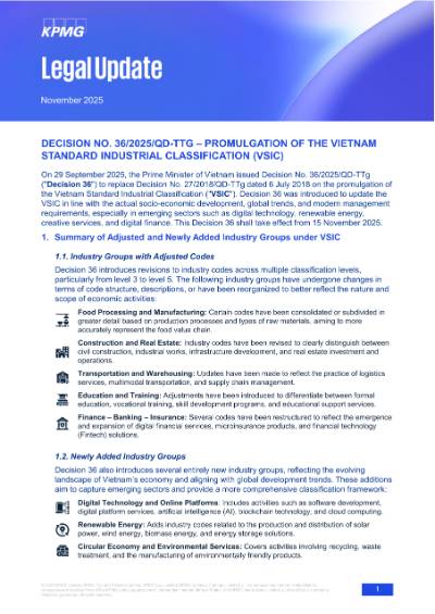 Ngày 29/09/2025, Thủ tướng Chính phủ Việt Nam đã ban hành Quyết định số 36/2025/QĐ-TTg (“Quyết định 36”) thay thế Quyết định số 27/2018/QĐ-TTg ngày 06 tháng 7 năm 2018 về việc ban hành hệ thống ngành kinh tế Việt Nam (“Hệ Thống Ngành Kinh Tế”). Quyết định 36 được ban hành để cập nhật Hệ Thống Ngành Kinh Tế phù hợp với thực tiễn phát triển, xu hướng toàn cầu và yêu cầu quản lý hiện đại, đặc biệt trong các lĩnh vực như công nghệ số, năng lượng tái tạo, dịch vụ sáng tạo và tài chính số. Quyết định 36 có hiệu lực từ ngày 15/11/2025.