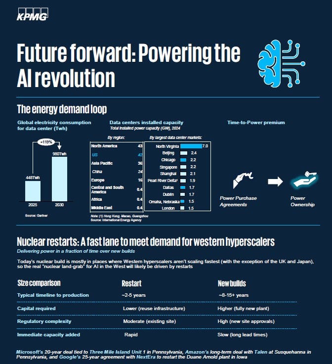 Today’s nuclear build is mostly in places where Western hyperscalers aren’t scaling fastest (with the exception of the UK and Japan, and pockets of India and Korea), so the real “nuclear land‑grab” for AI in the West will likely be largely driven by restarts.