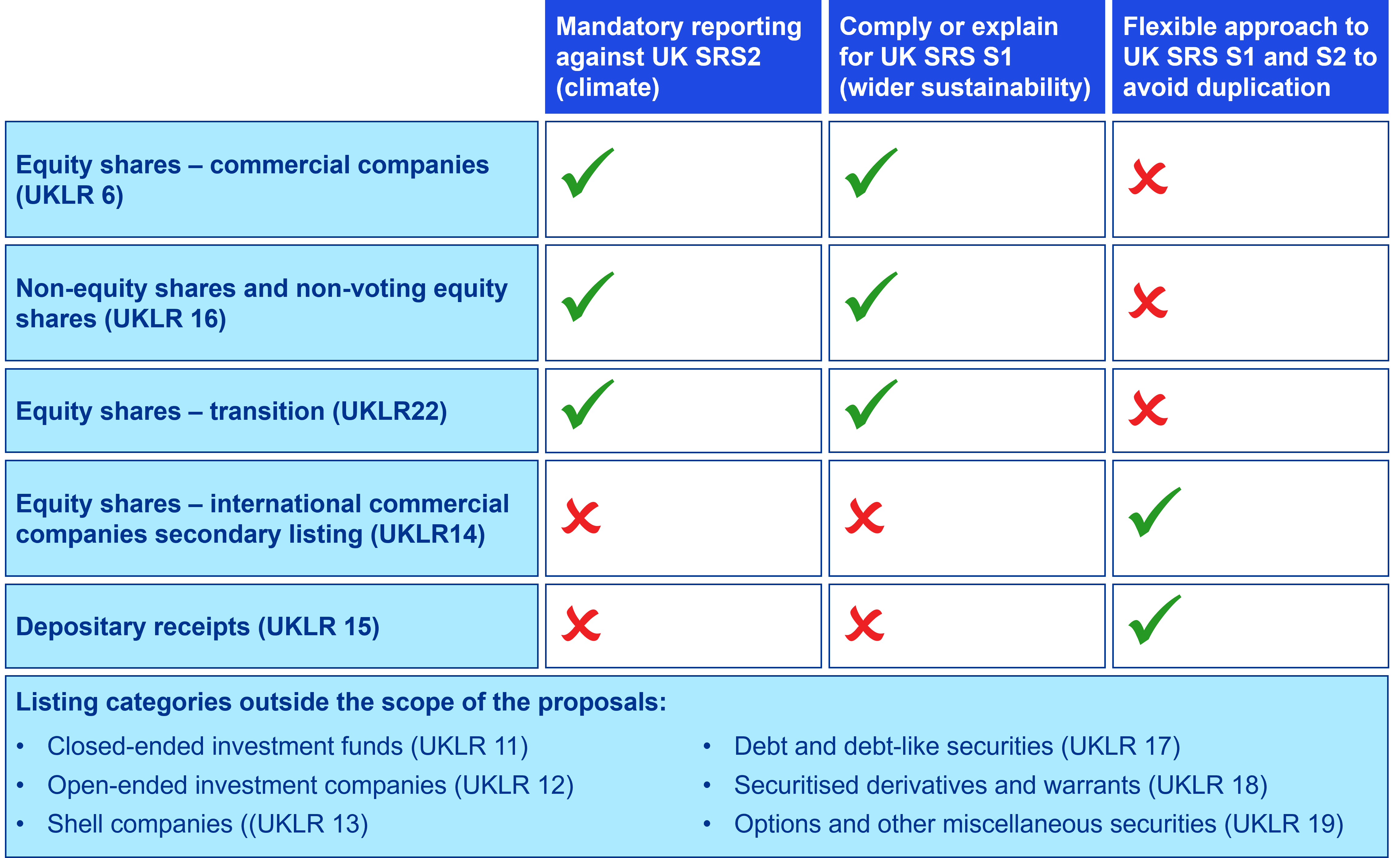 Firms categorised as commercial companies (UKLR6), non-equity shares and non-voting equity shares (UKLR 16), and transition category (UKLR22) will be required to move to mandatory reporting against UK SRS 2 (climate disclosures). There will be an exception for Scope 3 emissions data, which can be reported on a ‘comply or explain’ basis due to the difficulties in obtaining this data across the value chain.
