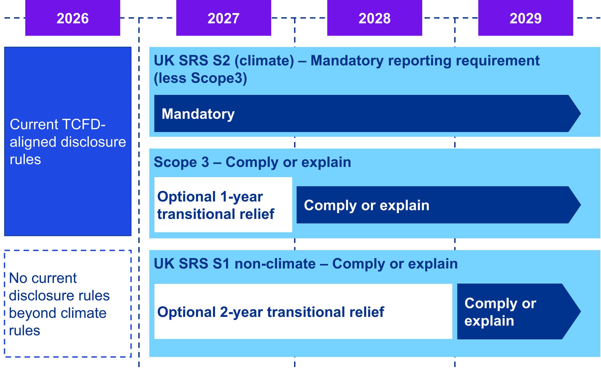 • Mandatory UK SRS S2 climate disclosures with Scope 3 emissions on ‘comply or explain’ basis – optional 1 year deferral for Scope 3