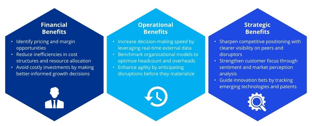 Rather than focusing only on the past (internal reports, historical KPIs), Outside-In analysis enables companies to see around corners by leveraging publicly available datasets, third-party intelligence, and advanced analytics.