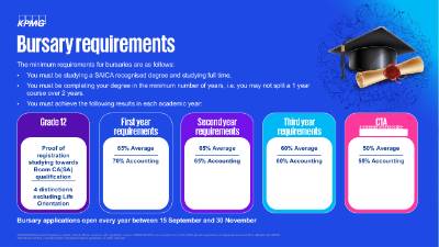 To apply for a KPMG Bursary you have to first apply for a training contract. Please click here to apply for a training contract. Bursary contracts are subject to you entering into a learnership (training contract) with KPMG that will start once you have completed your studies at a SAICA-accredited university i.e., obtaining a CTA/PGDA qualification.