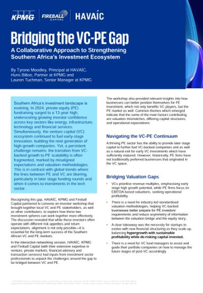 Southern Africa’s investment landscape is evolving. In 2024, private equity (PE) fundraising surged to a 13-year high, underscoring growing investor confidence across key sectors like energy, infrastructure, technology, and financial services. Simultaneously, the venture capital (VC) ecosystem continued to fuel early-stage innovation, building the next generation of high-growth companies. Yet, a persistent challenge remains: the transition from VC-backed growth to PE scalability is often fragmented, marked by misaligned expectations and valuation methodologies. This is in contrast with global trends where the lines between PE and VC are blurring, particularly in later-stage funding rounds and when it comes to investments in the tech sector.