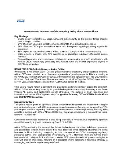 Wednesday, 5 November 2025 - Despite global economic uncertainty and geopolitical tensions, African CEOs are optimistic about their own organisations’ growth prospects. This is according to the KPMG 2025 Africa CEO Outlook Survey, which captures the perspectives of 130 CEOs across Southern, East, and West Africa. The survey forms part of KPMG’s global CEO Outlook, now in its 11th year, which includes insights from 1,350 CEOs across 11 markets.